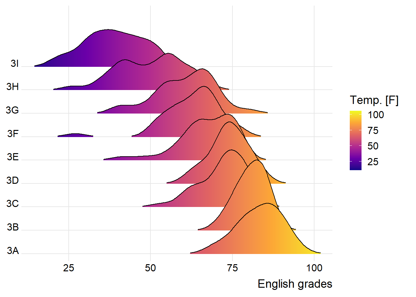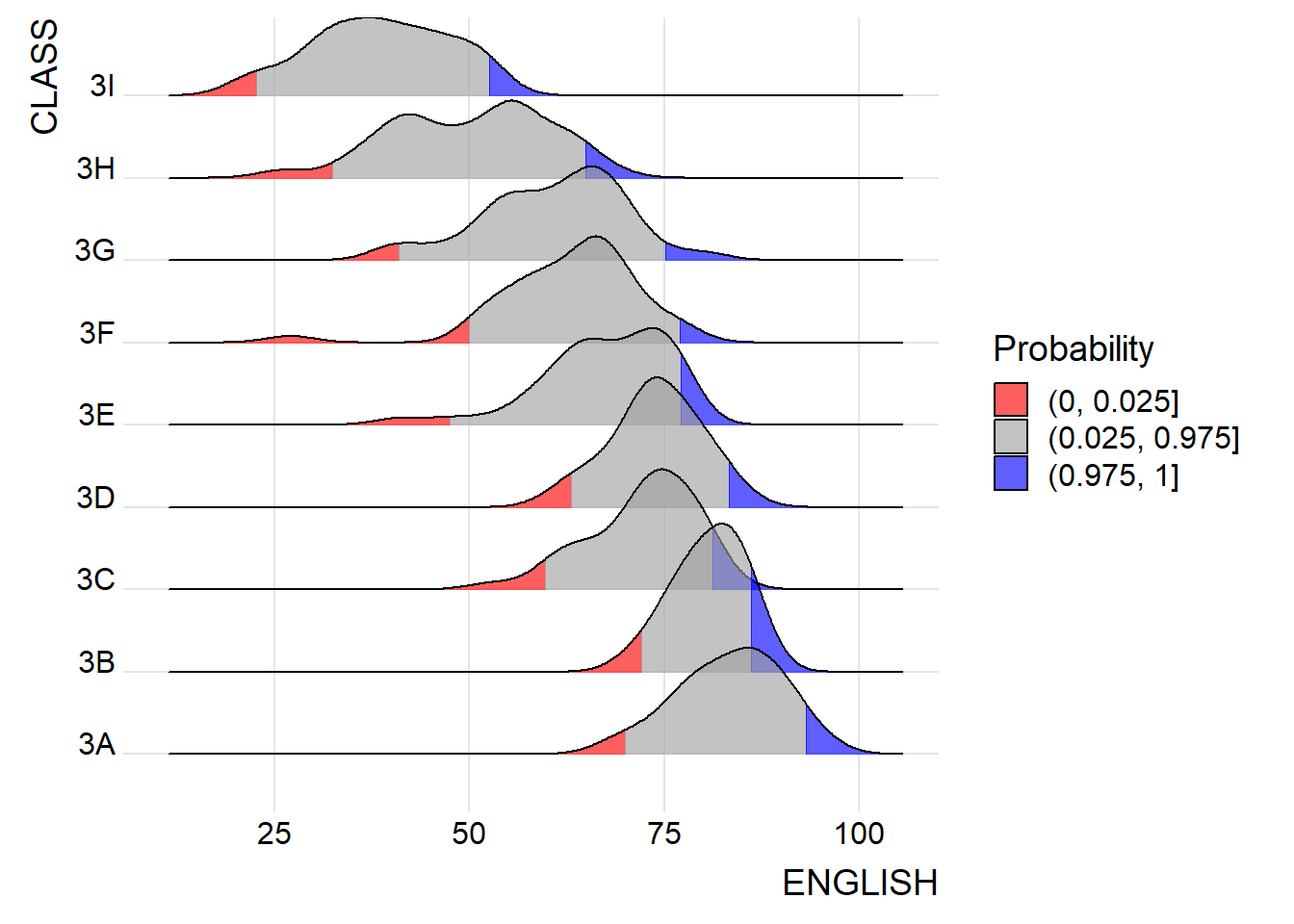 Figure below is a ridgelines plot showing the distribution of English score by class.