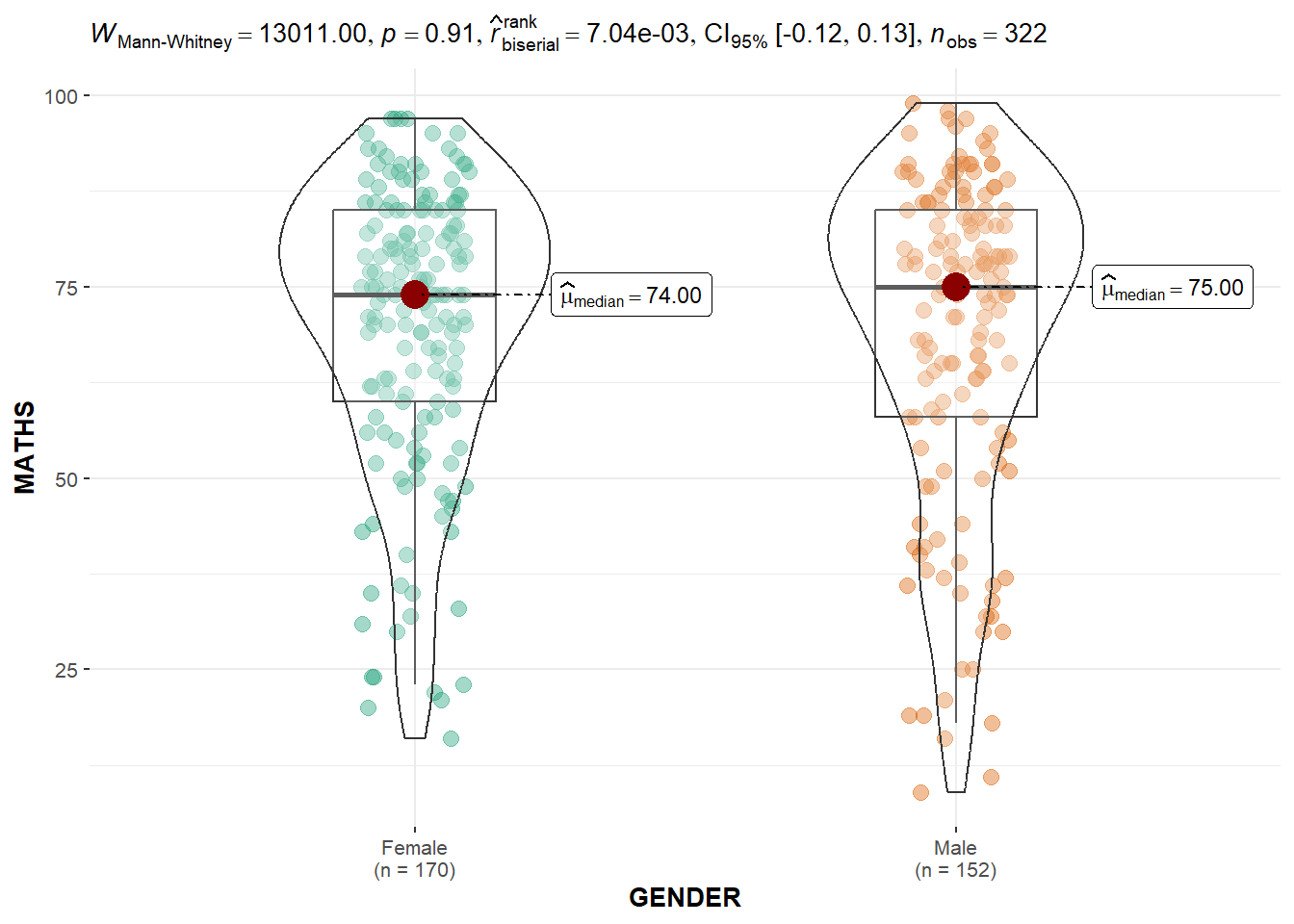In the code chunk below, ggbetweenstats() is used to build a visual for two-sample mean test of Maths scores by gender.