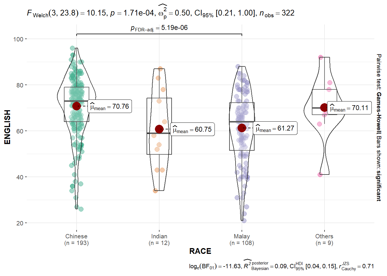 To follow best practices for statistical reporting. For all statistical tests reported in the plots, the default template abides by the APA gold standard for statistical reporting. For example, here are results from a robust t-test: