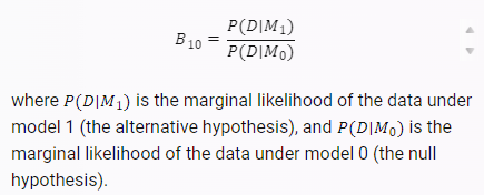 When we are comparing two hypotheses, H1 (the alternate hypothesis) and H0 (the null hypothesis), the Bayes Factor is often written as B10. It can be defined mathematically as