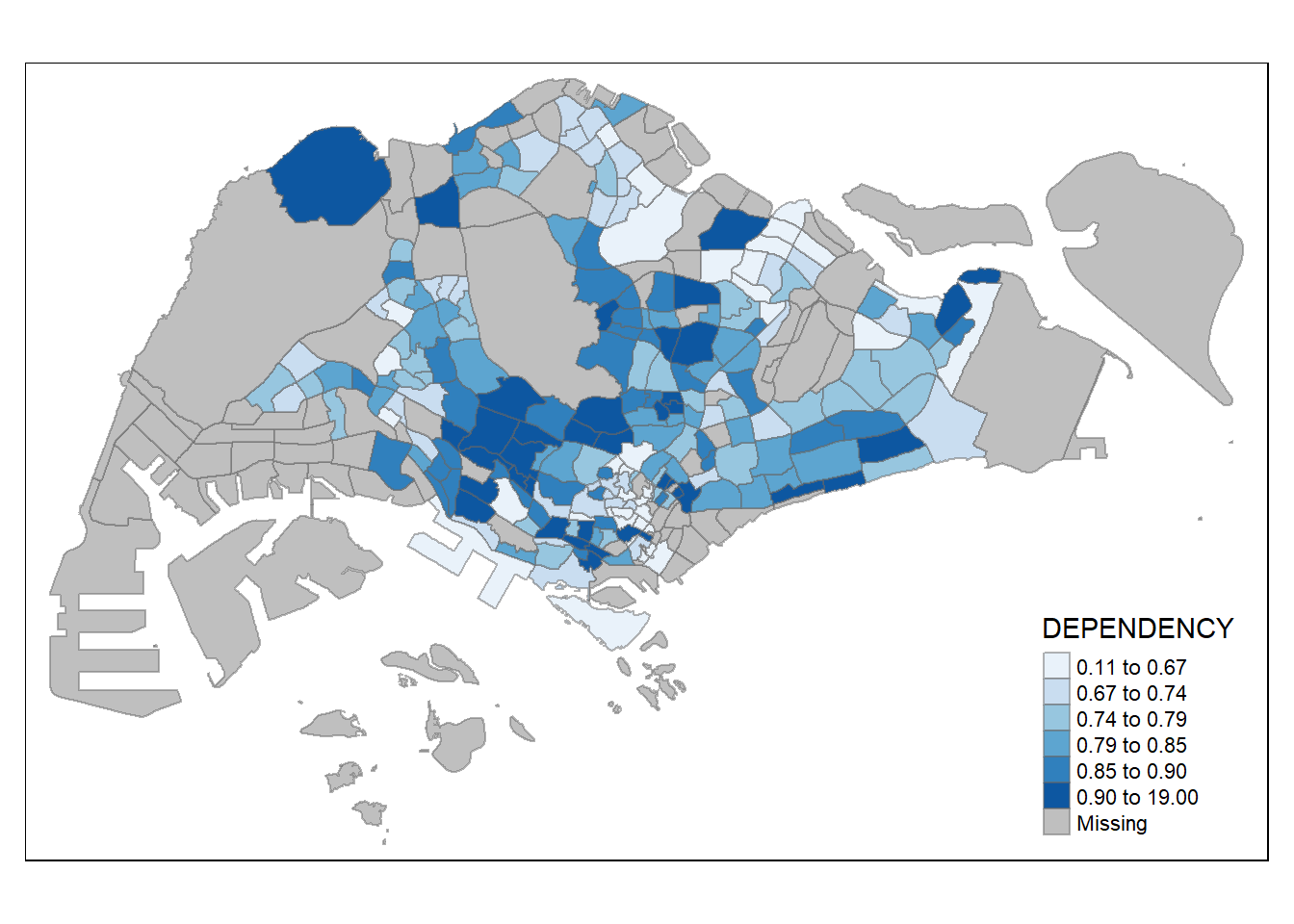tm_layout(main.title = "Distribution of Dependency Ratio \nby planning subzone",