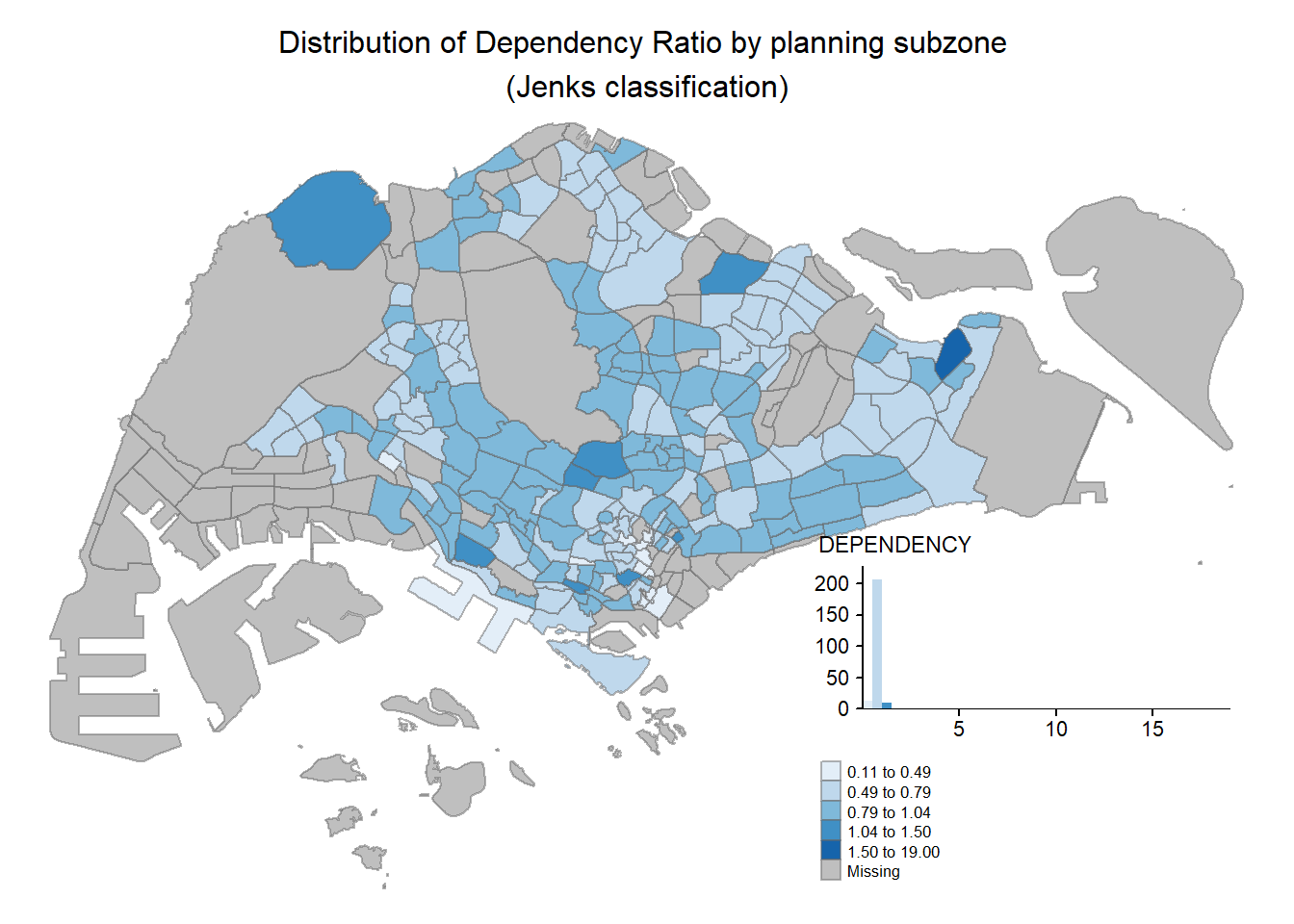 tm_layout(main.title = "Distribution of Dependency Ratio by planning subzone \n(Jenks classification)",