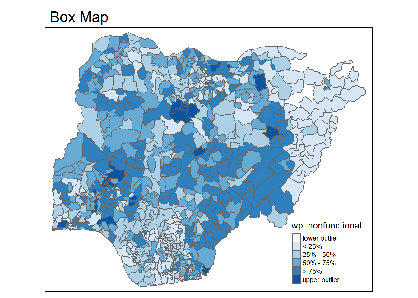 In essence, a box map is an augmented quartile map, with an additional lower and upper category. When there are lower outliers, then the starting point for the breaks is the minimum value, and the second break is the lower fence. In contrast, when there are no lower outliers, then the starting point for the breaks will be the lower fence, and the second break is the minimum value (there will be no observations that fall in the interval between the lower fence and the minimum value).