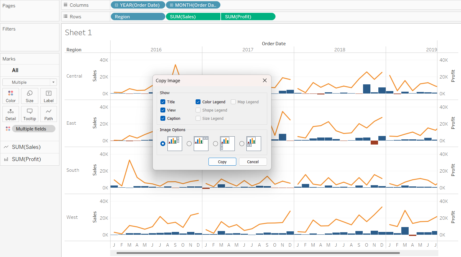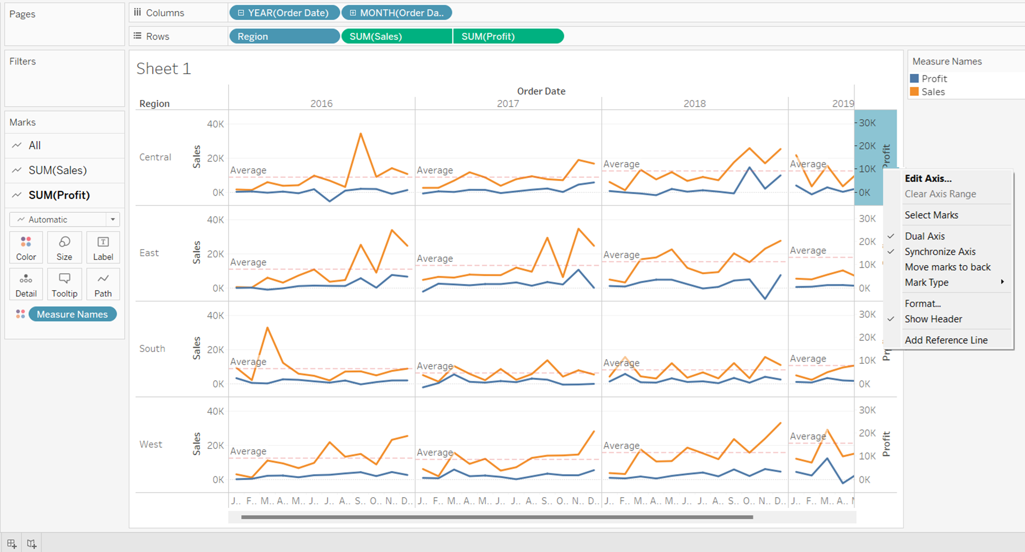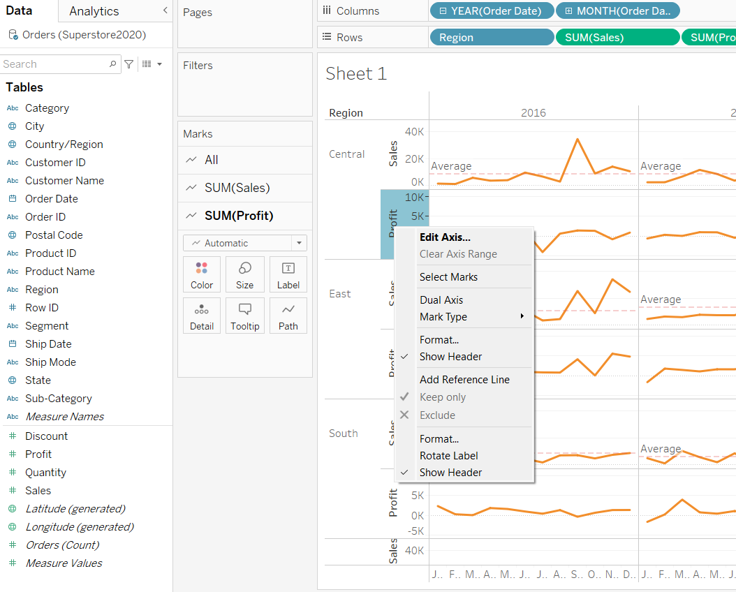 We will demostrate how to incorporate a dual axis plot. First, we drag the “Profits” into the Rows. Notice that graphs for the profits will created in each output pane. Next, we will hover around the profit y-axis, right-click, and select “Dual Axis”.