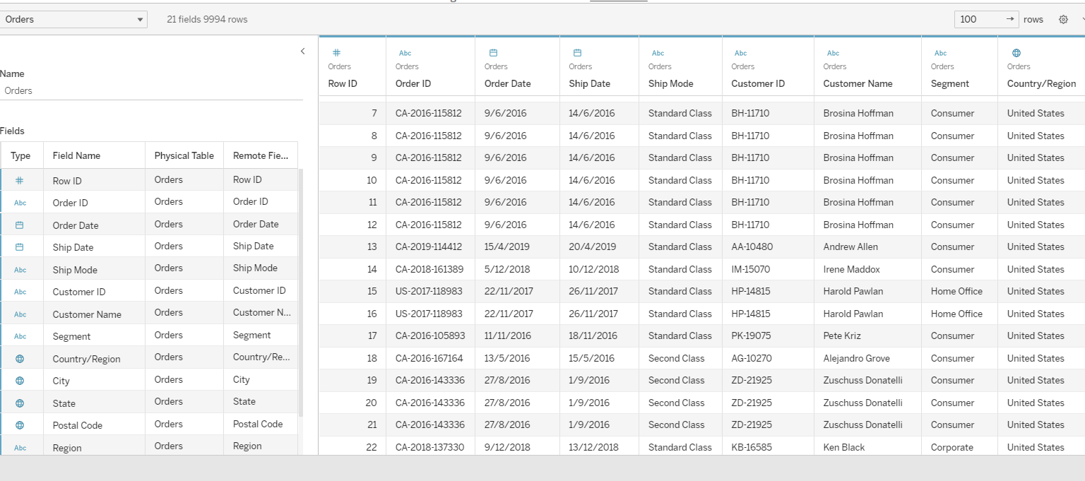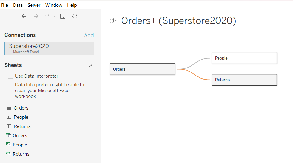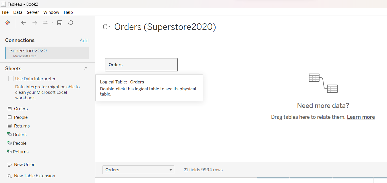 We can see that there are three sheets to choose from, which corresponds with the sheets in the data source file. We will first drag “Orders” into the main window.