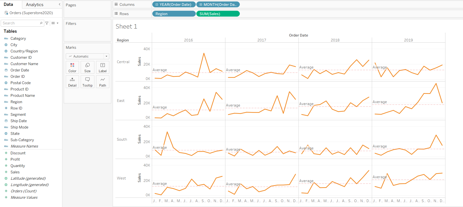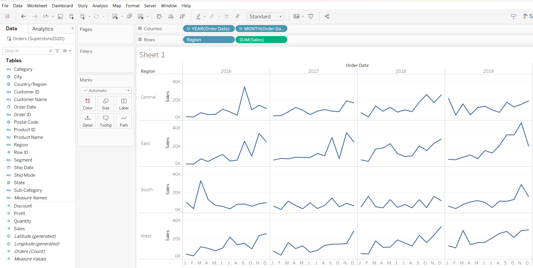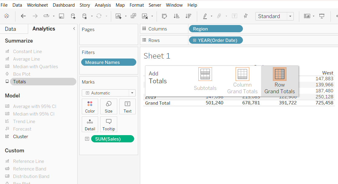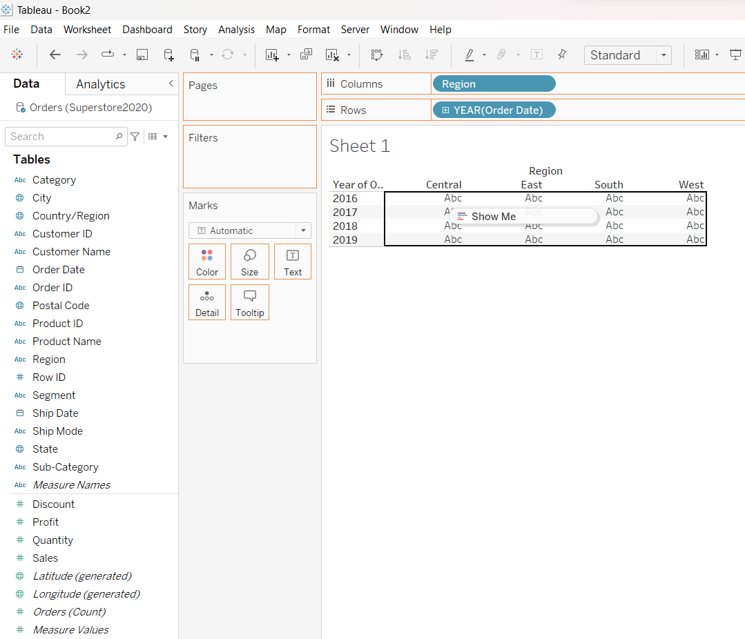 To create a table, first drag “Region” into the Columns and “Year” into Rows. After which, just drag “Sales” into the table itself, as follows: