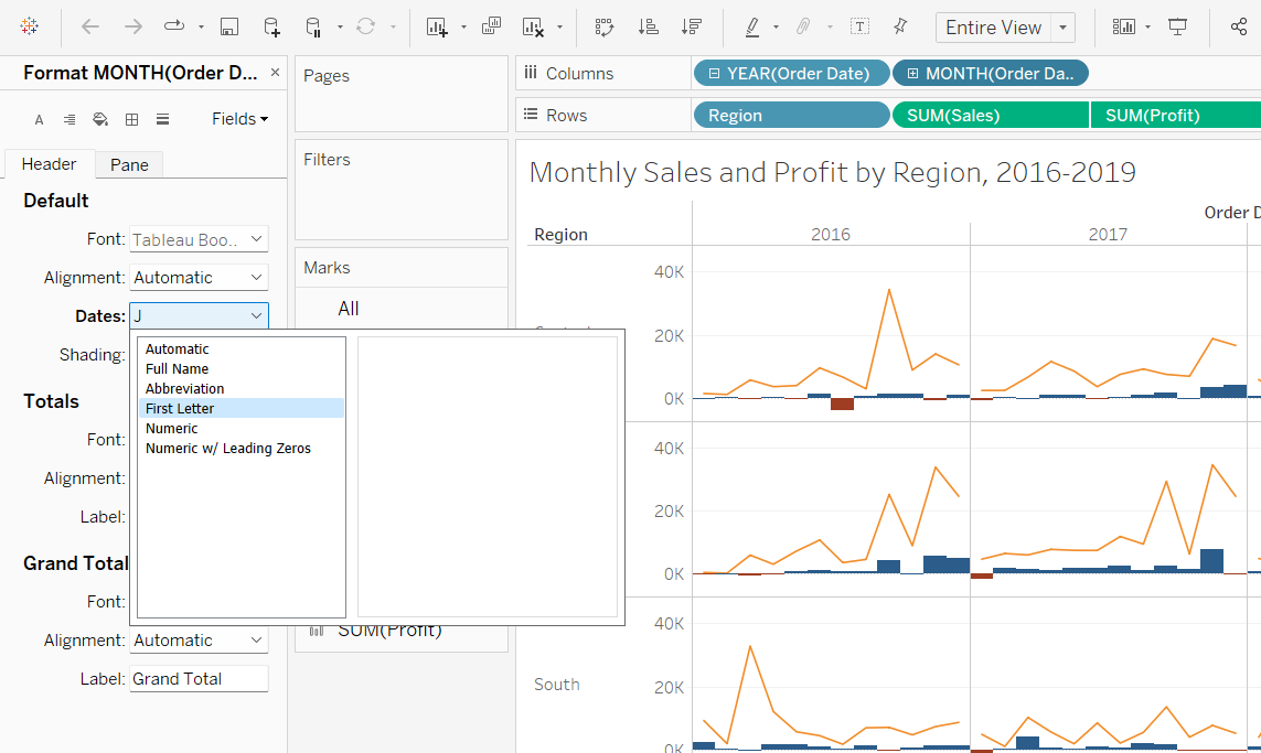 We observe that the x-axis titles are being cut off, resulting in the first letter being displayed, and the remaining letters reflected as “…”. To overcome this, simply hover over “Month” in columns, right-click and select “Format”. From the “Format” panel that popped out, select how you want the dates to be reflected on the axis.