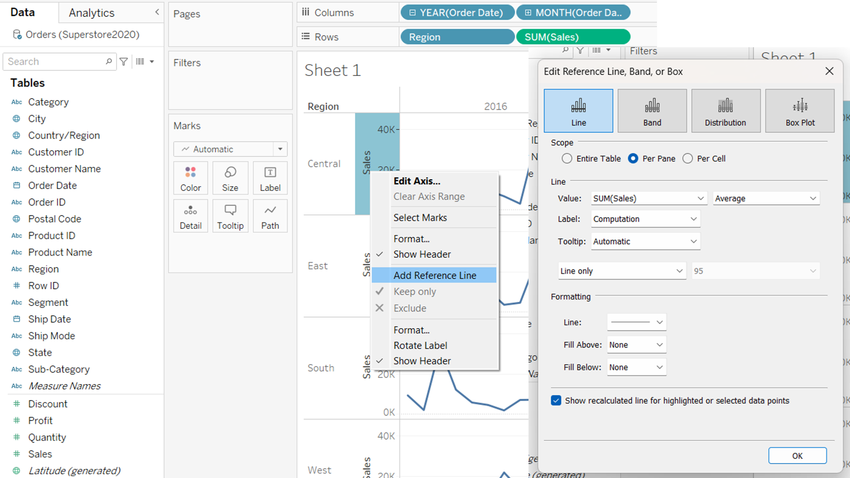 To add a reference line, simply hover around the y-axis, right click and select “Add Reference Line”. Thereafter, on the pop-out box, you can select the various options for “Scope”, “Line” and “Formatting”.